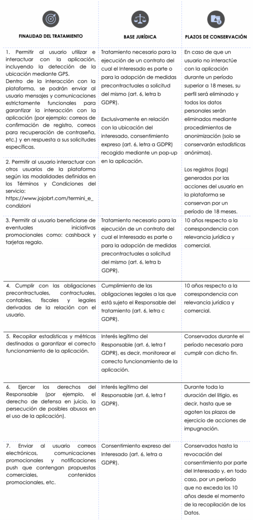 El suministro de datos para los fines del 1 al 6 es obligatorio. Si no se proporcionan los datos, el Responsable no podrá permitir que el usuario utilice la aplicación Jojob. El suministro de datos para el fin número 7 es opcional. Por lo tanto, el Interesado puede decidir no proporcionar ningún dato o posteriormente negar la posibilidad de procesar datos ya suministrados; en tal caso, no podrá recibir ofertas relacionadas con los Productos y Servicios ofrecidos por el Responsable.